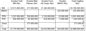 - Kekurangan pembayaran Bea Masuk Anti Dumping dan Pajak Dalam Rangka Impor sebesar Rp254.003,00 akibat pemeriksaan Bea Masuk Anti Dumping;